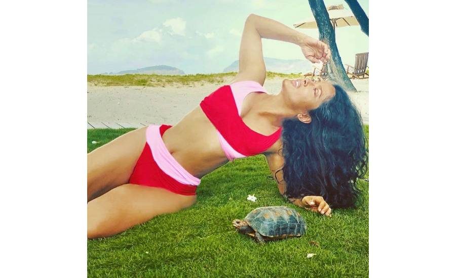 Los colores fuertes, como este en color rojo con rosa, sin duda le quedan perfecto a Salma, a quien le encanta tomar el sol para tener el bronceado perfecto.