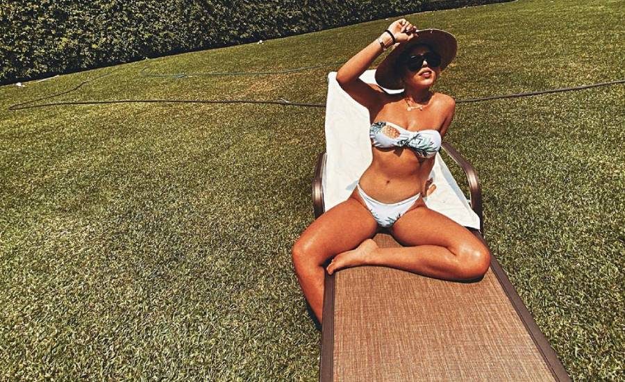 7.- Danna Paola no quiso desaprovechar el sol y se puso el bikini para salir al patio de su casa y agarrar un espectacular bronceado.