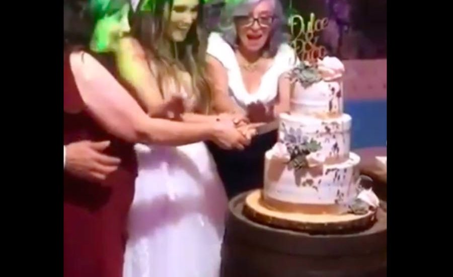 Dulce María se veía muy feliz partiendo el pastel de bodas.