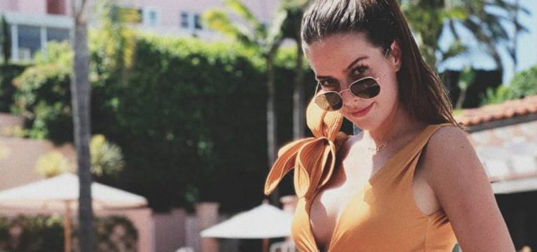 En la imagen, Claudia aparece en un traje de baño color mostaza que deja ver su pequeña pancita.