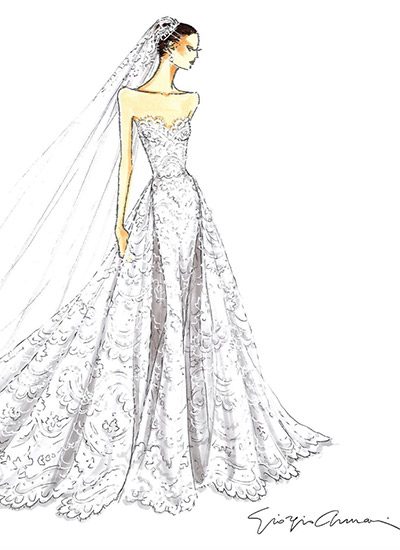 El vestido fue hecho a la medida, mismo que está hecho de encaje blanco con adorno de crinolina, con una falda con cola de encaje.