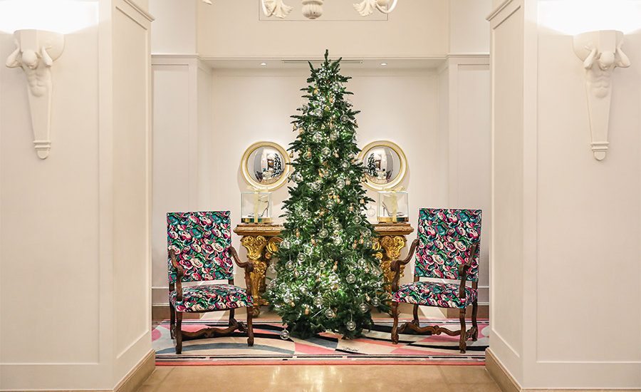 Los huéspedes del Hotel Savoy en Firenze, Italia, son recibidos por un gran árbol y pequeños árboles de Navidad, brillantemente decorados con adornos de plata y radiantes adornos de piña dorada la firma Aquazzura. La piña, el logotipo de Aquazzura, es un emblema de la hospitalidad, por lo que es la pieza central perfecta para esta asociación.