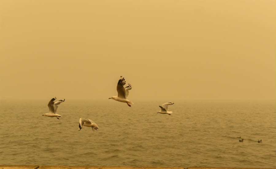 Aves en el borde del lago Burley Griffin, frente a la vista que generalmente mostraría la Casa del Parlamento (a 2 km) en Canberra Australia. Foto: Getty Images