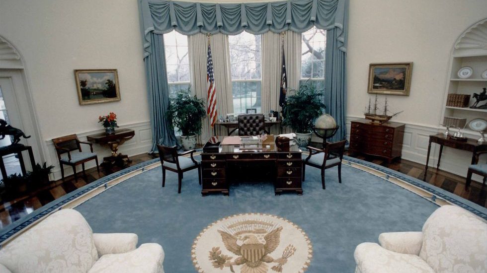 El nuevo presidente H.W. Bush cambió las persianas y el tapete de la oficina a un tono azulado, combinándolo con tonos pastel.