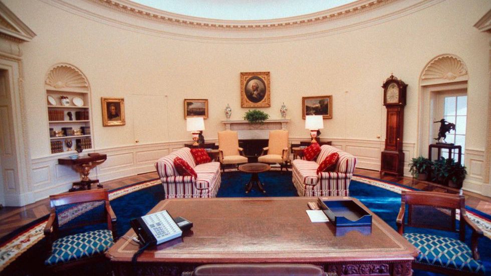 La decoradora Kaki Hockersmith de Little Rock fue la encargada de redecorar la Oficina Oval para la presidencia Clinton.