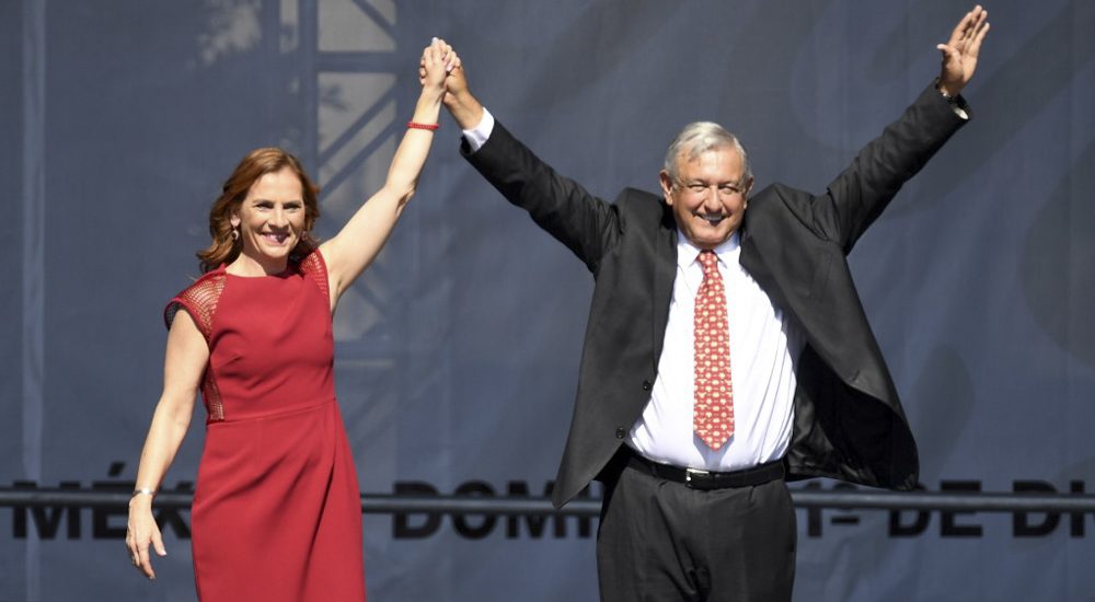 El mandatario festejó el aniversario de su elección, tras muchos años de contiendas y disrupciones, con un templete en el Zócalo de la Ciudad de México el 1ro de diciembre de 2019. Beatriz Gutiérrez Müller marcó la ocasión con un vestido de corte clásico en color rojo, que lucía unos interesantes recortes con redes en los hombros para darle un toque moderno. (Foto: Pedro Pardo / AFP)