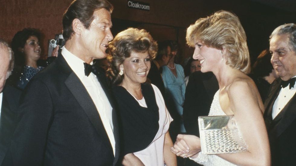 1983. Roger Moore no se salió de papel cuando conoció a la Princesa Diana. El mismísimo James Bond de esmoquin la recibió en el estreno en Londres de la película del superagente, “Octopussy”. (Foto: Getty Images)