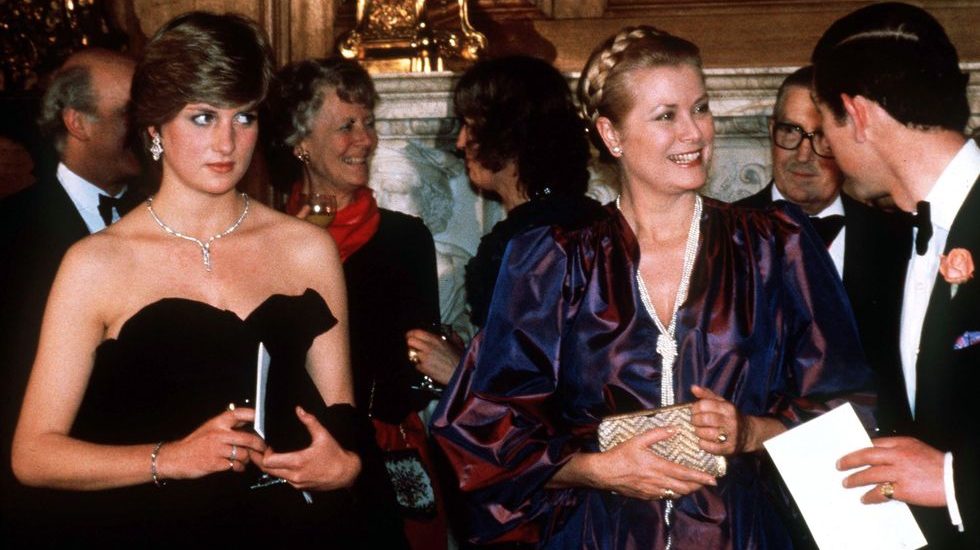1981. La Princesa de Mónaco conoció a la Princesa Diana en un evento de recaudación de fondos para el Royal Opera Hall de Londres, y usó un vestido ciruela con mangas abullonadas y un collar de perlas. (Foto: Getty Images)