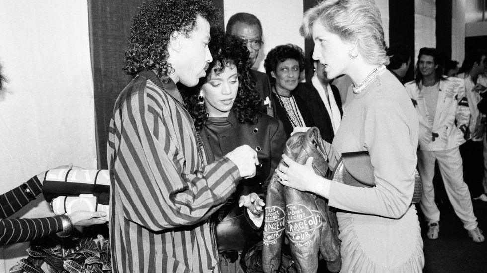 1987. Antes de que Lionel Richie se presentara sobre el escenario de Wembley, conoció a la Princesa Diana vestido con una chaqueta a rayas y le obsequió dos chaquetas de cuero infantiles como regalo para sus hijos. (Foto: Getty Images)