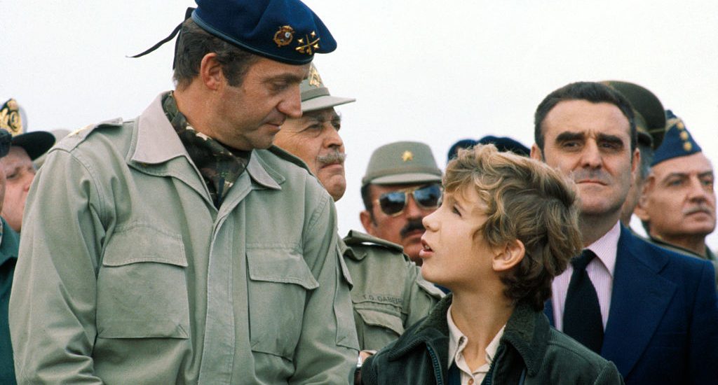 El rey Juan Carlos de España conversa con su hijo, el príncipe heredero Felipe, mientras observa las maniobras militares frente a las costas de España.