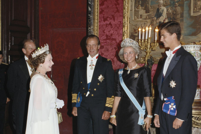 La Reina Isabel II y el Príncipe Felipe se encuentran con el Rey Juan Carlos I de España, la Reina Sofía de España y su hijo Felipe, Príncipe de Asturias, en el Palacio Real de Madrid, para un banquete de Estado en España, el 18 de octubre de 1988.