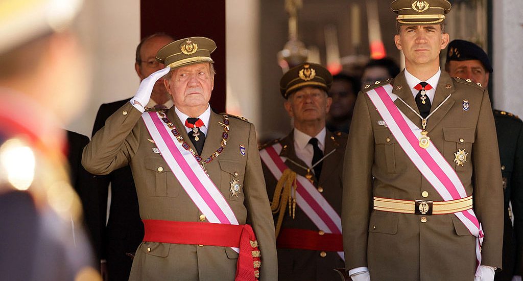 El rey Juan Carlos de España y el príncipe Felipe asisten a la reunión semestral de la Orden de San Hermenegildo el 3 de junio de 2014 en El Escorial, España.