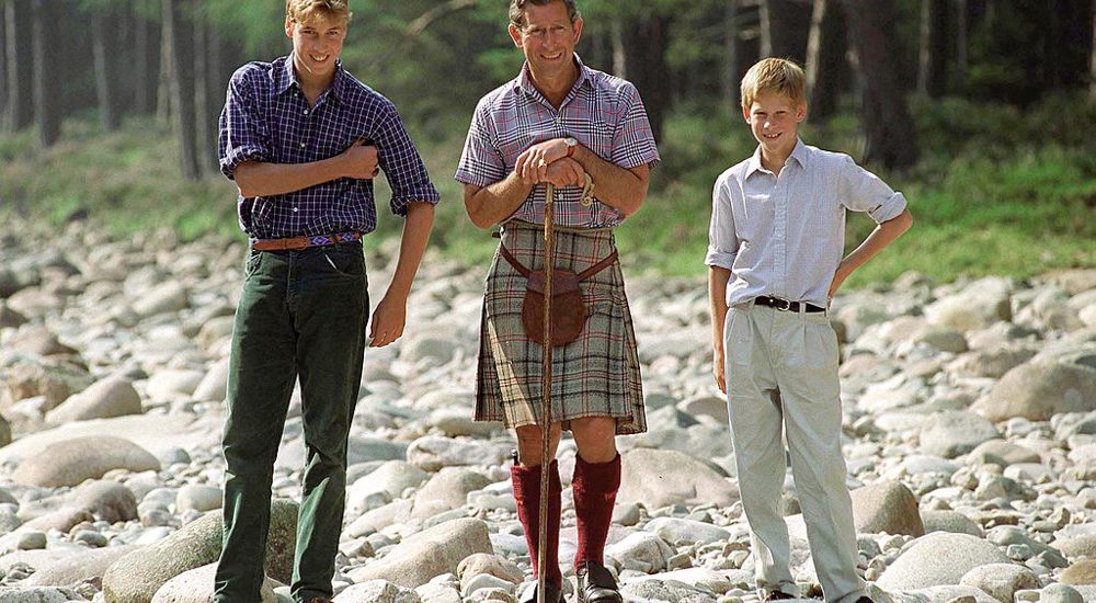El príncipe Carlos sostiene un bastón para caminar y viste una falda escocesa durante una visita a Balmoral con sus hijos. (Foto: Tim Graham Photo Library via Getty Images)